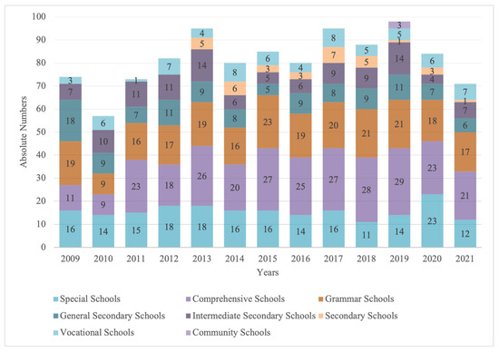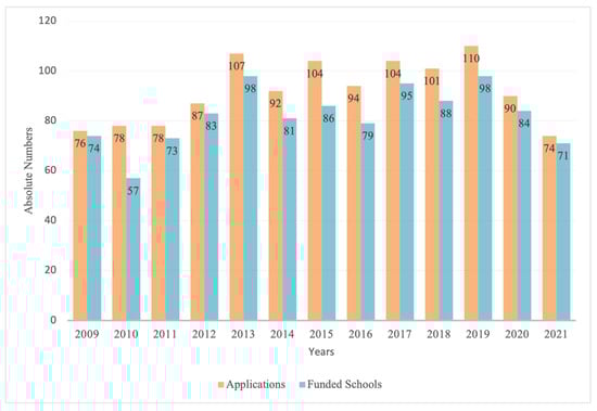 Figure 2 illustrates the number of applications and the number of funded schools. From 2009 to 2021, 1195 applications were submitted, and 1067 projects were funded. In the first five years, the data showed an increase in applications and funded projects. Until 2020, both remained roughly constant. From 2020, both decreased. Between 2009 and 2021, an average of 89% of projects were funded.