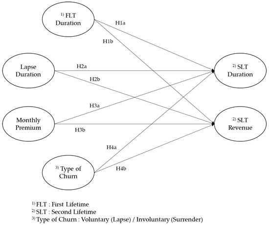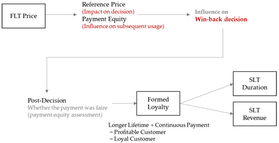 An important finding is that customer lifetime may differ in industries [54]. Customer loyalty should be measured differently based on the industry, service, or product features. This alerts us to be careful when defining the loyal customer. An ultimate loyalty definition might be unavailable, but lifetime and continuous payment for financial service can be considered loyalty that leverages a firm’s profit. For instance, the representative insurance feature is the warranty, existing for a specific contractual period with the amount of payment and protection. When a customer issues an insurance policy, they make an agreement that guarantees a certain service period by both customer (ongoing payment) and the firm (ensuring protection). For comprehensive understanding, Figure 2 depicts the sequential flow of how FLT price affects the SLT values. According to this logic, the relationships between FLT price and SLT variables are hypothesized as below.