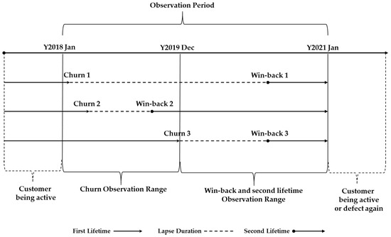 The data were collected from Jan. 2018 to Jan. 2021. Customer defection data were extracted from 2018. Furthermore, the data of customers’ win-back and their beginning of the second lifetime were extracted from 2019 to 2021. The final dataset consisted of 22,476 cases. Initially, the data were collected from a telemarketing sales channel. Duplicated records were eliminated and 41 outliers were removed; the original dataset consisted of 28,354 cases. However, the dataset was not qualified for analysis due to improperly generated records such as the ‘0’ premium. The insurance premium should be higher than ‘0’; thus, these cases were removed. Finally, 22,476 cases were confirmed to be eligible for analysis. The original form of the scenario is ‘Customer Timeline,’ which describes the first lifetime, lapse duration, and second lifetime [21]. We re-composed it with three possible churn scenarios, and Figure 3 describes them.