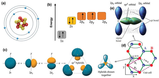 Carbon is placed as the sixth element in the periodic table with an electronic 1s22s22Px12Py12Pz0 ground state configuration, as illustrated in Figure 3b. The 2pz energy level is stabilized without electrons for convenience but equals the 2px and 2py energies. As shown in Figure 3a, of the six electrons, the four remaining in the outer shell are valence electrons, which encircle the nucleus of a carbon atom. These electrons can form three hybridization types in a carbon valence shell, namely, sp, sp2, and sp3. The formation of hybrids of sp2 is shown in Figure 3c. Since carbon atoms share sp2 electrons with their three nearby carbon atoms, they form a planar structure wave network layer, which is also called a monolayer graph. The graphene crystal unit cell is shown in Figure 3d, marked by a purple parallelogram, which has the same gate constant of 2.45 Å, and two carbon atoms. The stability of the planar ring is caused by the resonance and the relocation of electrons. The out-of-plane Ś bond is made by 2pz orbitals perpendicular to the planar structure, with a typical sp2 hysteria [37] of the two neighbouring carbon atoms on the graphene layer (see Figure 3e), while the in-plane bond is formed by the sp2 hybrid orbits (2s, 2px, and 2py). The resulting covalent μ bond is a short-length interatomic ~1.42 Å, making it more robust than the hybridized carbon/carbon diamond sp3 bonds. The monolayers of graphs, therefore, have remarkable mechanical properties (for example, a 1 TPa Young’s modulus and 130.5 GPa intrinsic strength) [38,39,40].