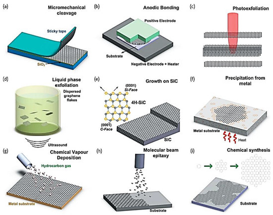 Most bulk graphene is produced with a top-down, exfoliating graphite approach which usually requires large quantities of solvent with high-energy mixing, shearing, sonication, or electrochemical processing [84]. As a result, a base-up amalgamation of great graphene is frequently limited to ultra-small sums whenever performed by substance fume testimony or by progressed engineered natural techniques, or it gives an imperfection-ridden structure whenever completed in mass arrangement [85,86].