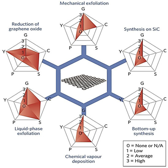 The stable graphene production procedures on the scale of 0–3 have vital characteristics. G means graphene quality, s means graphene applicability, p means graphene purity, and y means graphene output [49].