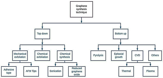 Graphene synthesis is a process for manufacturing or extracting according to the product’s desired size, purity, and efflorescence. Different techniques to produce small graphic films were found at the earlier stage. Carbon was precipitated on metal surfaces by the late 1970s in the form of thin graphite layers [44,45]. Graphene is best explained as a single, delicate layer of graphite, the soft, flaky substance used in pencil lead. Graphite is an allotrope of the element carbon, which means that it has the same atoms, but it is arranged differently and gives the substance varied characteristics. For instance, diamond and graphite are both carbon sources, but they differ significantly. Graphite, although fragile, is exceptionally sturdy. In diamonds, however, the graphene atoms are structured hexagonally. It is interesting to note that when graphite is removed, it assumes specific miraculous properties. It is just a single atom, the first two-dimensional substance ever discovered. There have been ongoing efforts to develop high-quality graphene both for research and possible applications in large quantities. Graphene preparation methods can be divided into top-up and bottom-down methods [46].