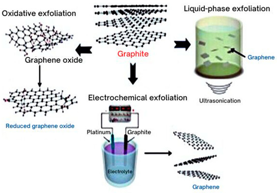 The experimentally designed model of graphene production from graphite is carried out by the chemical treatment process. A few routes were described by the author [77], as shown in Figure 9. The first step refers to the process, named oxidative exfoliation, wherein reduced graphene oxide is produced. The second step is liquid-phase chemical exfoliation of graphene by chemical and ultrasonication. Lastly, the route for preparing graphene is electrochemical exfoliation. One conventional method of preparing graphite in large quantities is the chemical reduction of graphite oxide. Graphite oxide (GO) is typically synthesized using oxidants, including concentrated sulphuric acid, nitric acid, and Brodie-based potassium permanganate, the Staudenmaier method, and the Hummers method through an oxidation process [78]. Reducing graphite oxide or graphite oxide into graphene is one of the low-cost methods used in large-scale graphene production. This method is currently the most popular method for producing graphene materials due to its possible scalability, high efficiency, and excellent dispersibility in different solvents, making processing easier for a variety of applications [79,80]. Sonication and graphene oxide (GO) reduction are other approaches to graphene production. H2 is added throughout the alkenes, coupled with nitrogen gas extrusion, which is used to reduce the excess NaBH4 as a reducing agent [81]. In the planning of RGO/graphene, 100 mg of as-arranged GO was scattered in 30 mL of every natural dissolvable (di-ethylene glycol (DEG), isopropanol (ISP), n-butanol (BA), n-hexylamine (HA), and ethyl acetic acid derivation (EA)) exclusively with the guide of gentle ultra-sonication for 1 h. A homogeneous arrangement was shaped, prompting a steady scattering proceeding to additional peeling of GO. The arrangements were then moved to a universally useful autoclave made of tempered steel (SS-316) furnished with a Teflon liner with a 30 mL limit. The autoclaves were kept at a temperature of 200 °C in a hot air boiler for 24 h and, afterward, permitted to chill to room temperature. The items were washed a few times with deionized water and ethanol, followed by centrifugation at 4000 rpm for 30 min. The last resultant items were saved for drying in a vacuum stove at 80 °C for 24 h, bringing about a fine, dark powder known as RGO/graphene [82].