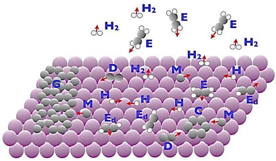 Typical epitaxy processes were illustrated by Tetlow et al. [95,103]. Some of these processes may need to be modified according to the material and the method of growth. First, starting with the filing. This is a testing process both in terms of the deposition and the deposited species. In the simplest case, the atomic (or molecular) component of the growing material is the deposited species, as this is often used in the growing thing of graphene, assuming that these are polyatomic precursors, E. In the latter, the kinetic of reaction is important, as certain surface sites can prevail in catalytic activity, and reaction products are to be desorbed from the surface (as shown by the hydrogen molecules H2). Even the atoms of the increasing material can desorb at high temperatures from the surface (not shown). The atomic species, M, diffuses on the surface after deposition and possibly decomposition kinetics. Even such an easy process can include difficult steps, such as exchanges, or even the forming of dimers, D, or larger C carbon clusters which migrate over the surface. The diffusing species concentration increases as deposition progresses and eventually reaches the level of G islands. This can occur through several processes. The colliding of two or more migratory species occurs in homogenous nucleation, binding then to an island. This island can be stable or break up depending on the temperature. The concentration of migratory species is eventually sufficient to induce the formation of the island, although many of these units are necessary. The rate of nucleation increases with the presence of a surface defect such as a vacancy, dislocation of the screws, or a previous step edge in heterogeneous nucleation, which is shown in Figure 11.