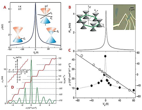 Each unit of graphene has two atoms of carbon which cause two equal, tapered intersection points (K and K′) within each Brillion area, and energy is linearly associated with the wave vector at the intersection point [107,108]. During transport, the electrons in graphene do not become dispersed. As graphene electrons can move like zero mass particles, the electrons propagate at room temperature more quickly than any known conductor. Graphene electrons do not scatter as a consequence of gill or foreign electron defect in orbit; the graphene’s average free path can, therefore, reach 1 μm, and the general material’s average free path is within the range of the nanometer [109,110]. The graph bands are symmetrical for conduction and valence. Two kinds of electron and hole carrier are available. The ambitious electric field effects of the graph of one layer are shown in Figure 12A [111,112].