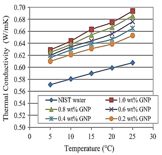 Figure 14 shows data on the thermal conductivity of GNP nanofluids with different concentrations and temperatures of nanoparticles. For comparison, NIST thermal conductivity values for water were obtained. The GNP nanofluid values of thermal conductivity rose linearly with the fluid temperature, as shown in Figure 9. For a maximum of 1 wt percent GNP of nanofluid at a temperature of 25 °C, the maximum thermal conductivity increase was 14.2%, while a minimum of 0.1 wt percent GNP of nanofluid was achieved at 5 °C [128].