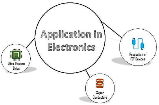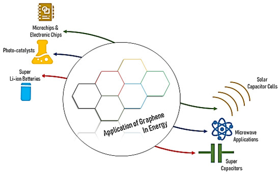 Graphene is the most straightforward, most robust material that has ever been found and has shown its capacity in various fields. In addition, graphene has consolidated itself as an invaluable material whereby many applications can be improved or revised in the existing paradigm. It has provoked a good response in the commercial field of synthesis and processing, construction, electronics, energy storage, telecommunications, composites, military and defence, aerospace, biomedicine, energy generation, and automotive industries. As seen in the given pie diagram (Figure 1), we observed that the most significant portion of graphene is used in the electronics and energy storage sector as well as in the aerospace sector, which means graphene is a driver of modern technology applications [31].