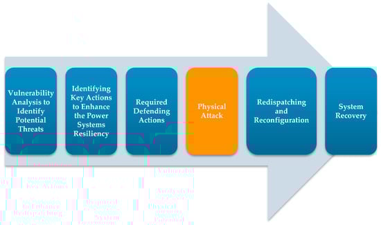 To mitigate physical attacks and conduct proper actions, estimating the characteristics of potential attacks is important [11]. From a viewpoint, the physical attack may be a single attack [12] or multiple attacks [13]. From another perspective, the attacks may be conducted in one action (during a single time interval) [14] or during a multiple time period [15]. The amount of attack resources (budget) is another factor related to the characteristics of a physical attack [16]. Understanding such characteristics can contribute to mitigating the sabotages of the power system. Different stages of power systems protection against physical attacks are shown in Figure 3.