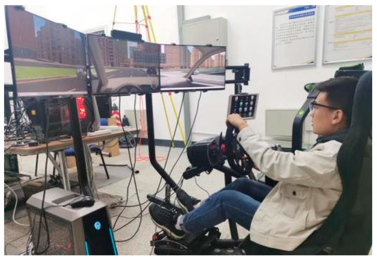 Due to the execution of driving behaviors in the driving process, there will be road traffic safety hazards, so we carried out in the form of driving simulation. Using Up-Coming’s driving simulator and its UC-win/Road simulation software, the test platform was built, as shown in Figure 2. The road type in the test scene is a two-way six-lane urban road with a total length of 10 km. The vehicle runs in the middle lane. The traffic flow on both sides of the target vehicle is set to 260 pcu·h−1. The traffic flow in each lane obeys uniform distribution. The average speed of traffic flow is 50 km·h−1 [24,25].