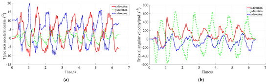 Six-axis data of hand trajectory. If there are multiple panels, they should be listed as: (a) Triaxial acceleration curve of hand track; (b) three-axis angular velocity curve of hand trajectory.