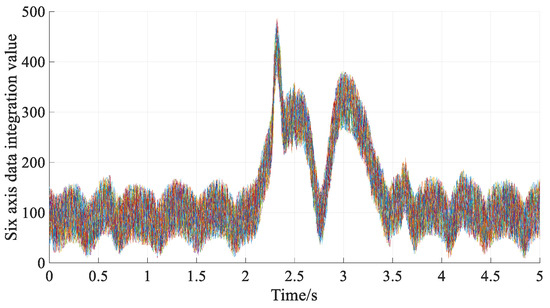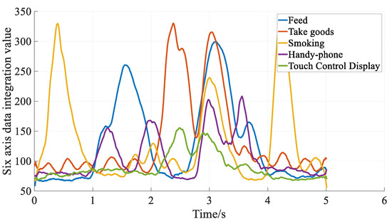 Step 1: The characteristics of the driver’s hand movement in the driving process can be characterized by the change of the six-axis data (triaxial acceleration and triaxial angular velocity) of the hand movement, and the use of the six-dimensional data has too many calculations in the comparative calculation. In order to reduce the number of model calculations, the six-axis data are reduced to one-dimensional data by Formula (1).