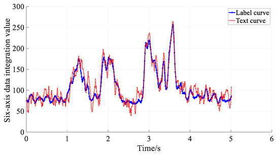 Figure 13 is the shortest path curve of the DTW algorithm for the label curve and test curve. The blue curve is the label curve, and the red curve is the test curve. If the time series data of the same curve are used as label and test curve, the label and test curve after DTW regularization are consistent with the original curve, then the length of the time series after regularization is equal to that before regularization. The time series length of the curve before normalization is 500, and the time series length of the curve after normalization is 618. The label and test curve of the handheld phone is calculated by Formulas (2)–(4), and the shortest distance of the curve path is 4239.75. The matching degree of the curve is 85.43% by Formulas (5) and (6).