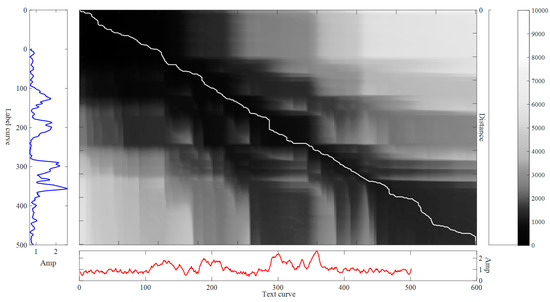 Figure 12 is the shortest distance visual graph of the DTW algorithm, in which the blue curve is the label curve and the red curve is the test curve. In the gray image corresponding to the two curves, the white trajectory line is the DTW algorithm to regularize the shortest path time series curve. If the white trajectory line is diagonal, the higher the matching degree of the label curve and the test curve. The color on both sides of the white trajectory represents the shortest distance between the label curve and the test curve corresponding to the time series. The color is a gradual change from black to white, black represents the shortest distance of 0, and white represents the shortest distance greater than 10,000. The shortest path time series curve of the DTW algorithm in Figure 12 is close to the diagonal line, which shows that the label curve and the test curve match well.
