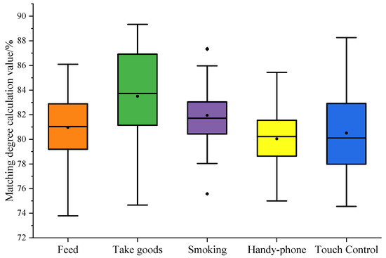 Since there are very few delays in the data acquisition device, the threshold determination and algorithm comparison in this study is only for normal data acquisition. In order to determine the recognition threshold of different dangerous driving behaviors, the hand trajectory and tag trajectory of 30 subjects were matched and calculated, and the box diagram of the matching degree value was obtained, as shown in Figure 15. Taking the minimum matching degree of five dangerous driving behaviors as the recognition threshold, the recognition thresholds of dangerous driving behaviors are as follows: the recognition threshold for eating is 73%, the recognition threshold for taking is 74%, the recognition threshold for smoking is 75%, the recognition threshold for handheld phone use is 75%, and the recognition threshold for using a touch control is 74%.