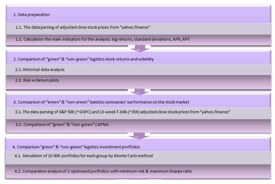 The research has some limitations. We have only considered companies in the US transport and logistics sector, which reduces the heterogeneity of the data and eliminates institutional differentiation. Additionally, we investigated companies with different firm sizes, since we were examining the general trend of green and non-green groups of logistics stocks. Future research may consider other indicators that can influence companies’ stock performance (e.g., market value, net income, Tobin’s Q, financial leverage) using panel data analysis. In addition, the resilience of green stocks to crises may be investigated by event study analysis.