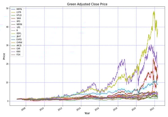 In a preliminary analysis of the dataset, the historical data of companies’ adjusted close prices was obtained to observe the collapses in stock prices, and log returns were calculated on the basis of the adjusted close prices. The graph of green companies’ adjusted close prices is presented in Figure 2.