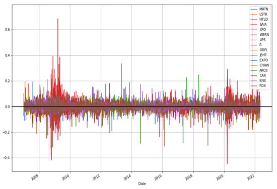 The current article investigates stock returns and fluctuations among logistics companies using data from Wharton Research Data Services [28] and Yahoo! Finance [29]. It considers the daily historical stock data for 32 logistics companies operating in the US and listed on the US stock market. The US stock market was chosen as the most appropriate market for statistical analysis as it provides the greatest number of green logistics companies to compare with non-green ones on the same market. The data cover the period from 1 January 2007 to 4 April 2022. The companies are divided into two groups by their overall ESG risk score for February 2022. The first group comprises companies with ESG scores lower than 25 and exposure level is ‘low’; these are called the green companies. ESG risk was obtained by Wharton Research Data Services from the Sustainanalytics database. The overall ESG risk is a news-based factor that is calculated as the sum of environmental, social and corporate governance risks by Sustainanalytics. Environmental risk calculates the risk arising from factors primarily attributable to environmental issues. Social risk calculates the risk arising from factors primarily attributable to a company’s relations with its employees, for example in terms of salaries, education, workplace diversity policy and inclusion, as well as its relations with customers. Governance risk calculates the risk arising from factors primarily attributed to a company’s management policy, such as its laws, rules and regulations.