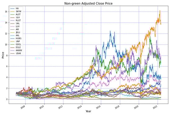 From Figure 4, which shows the adjusted close prices for the non-green group, it is clear that there is no general trend, and the companies’ values are more heterogeneous than those of the green group. It is also notable that the maximal prices of the green group are higher than those of the non-green one.
