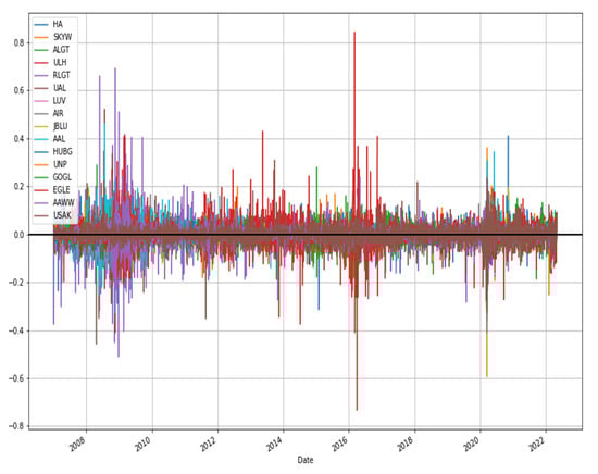 In general, it can be highlighted that values of non-green companies’ log returns are more volatile, as can be seen from the graph of their stock prices (Figure 4). However, the peaks of log return volatility can be distinguished in Figure 5. These include: