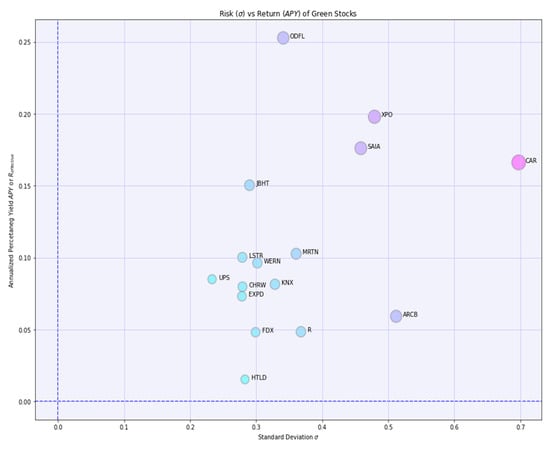 The green group stocks are shown mostly to have standard deviation equal to about 0.3 and APY of about 10%. Nevertheless, some stocks are riskier; for example, Avis Budget Group Inc. (CAR) has a standard deviation of −0.7 and an APY of −17%. Some stocks are more profitable and less risky, such as Old Dominion Freight Line (ODFL), with an APY −25% and a standard deviation of −0.34.