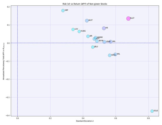 On the other hand, Figure 9 shows the risk versus return plot of stocks in the non-green group. If the two scatterplots are compared with each other, it should be noted that the general performance of companies in the non-green group is worse. Although all the observed green group stocks have positive APY, four out of the 16 non-green group companies have negative APY; moreover, although most of the companies have positive values of APY, these are close to zero and with higher standard deviation (about 0.5), in comparison with green stocks (0.3).