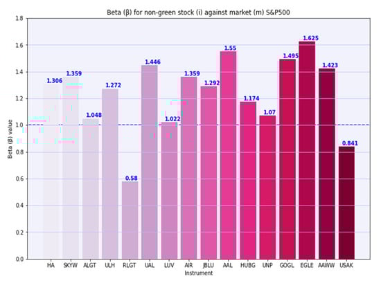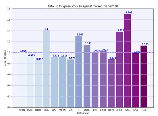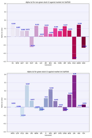 In the current article, individual green logistics stocks were less volatile than non-green ones but more volatile than the market (S&P 500), according to the results of standard deviation values and an analysis of stock log returns, especially during periods of high volatility on the US stock market (crises, news shocks). Additionally, CAPM analysis indicated better performance of green logistics stocks in comparison with the US market (S&P 500) than non-green stocks. Analysis of alpha values showed that some non-green alphas had the lowest value, equal to −0.27 (EGLE, which had the highest average risk and lowest average loss in returns), −0,13 (USAK) and −0,12 (RLGT). Five green stocks had negative alphas, with HTLD having the lowest value (−0.115); nevertheless, with the exception of HTLD, green stocks did not exceed 0.1 and were close to zero, in the range of –0.1 to 0.4, meaning that investment in such stocks would earn adequate returns for the risk taken, leading to more investor confidence. All non-green stocks with negative alpha exceeded 0.1, which is why, in comparison with green stocks, investment in these is riskier for the returns.
