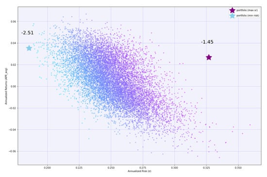 It can be seen that in the portfolio with the least risk, the annualised return is 0.035, the annualised risk is 0.186 and the Sharpe ratio is −2.505. In the portfolio with the maximum Sharpe ratio, the annualised return is 0.027, the annualised risk is 0.327 and the Sharpe ratio is −1.447. Both portfolios have negative Sharpe ratios, meaning that the risk-free rate is greater than the portfolio’s return. This is explained by the fact that the stock market is under pressure from crises and geopolitical shocks at the moment.