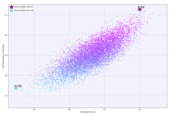 We are not only interested in the expected return and risk of a collection of individual instruments, we also need to obtain some insights and information on the portfolio of stocks as a whole. We thus implemented the fourth stage of the research algorithm, which consists of a comparison of green and non-green logistics portfolios. For the portfolio optimisation, we used the Monte Carlo method (or simulation) to model the probability of different outcomes in a process that could not easily be predicted due to the intervention of random variables. It is a technique used to understand the impact of risk and uncertainty in prediction and forecasting models. For this study, it was used to conduct repeat random sampling of the input space to generate 10,000 probable portfolios, based on calculated risks and returns, for the two groups: green and non-green. The sum of assets’ shares was equal to 1. Expected return and risk of the portfolios are presented in the earlier formulas. For this article, a comparison of the two kinds of portfolio was provided in terms of minimum risk (standard deviation) and maximum efficiency (the Sharpe ratio). The Sharpe ratio (Equation (5)) is the ratio of the expected excess return of a portfolio to the portfolio’s volatility. Therefore, an optimal portfolio should maximise the Sharpe ratio. A large Sharpe ratio indicates that an instrument’s returns (APR) are large relative to its volatility (standard deviation).