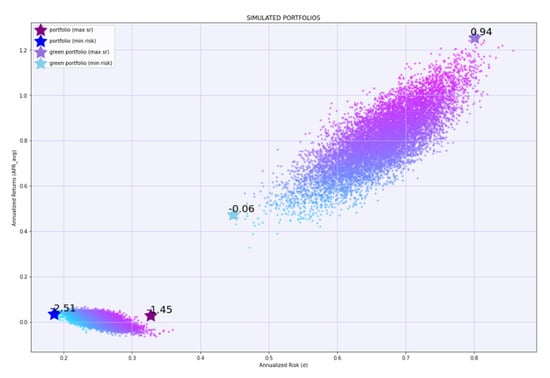 It can be seen that in the portfolio with least risk, the annualised return is 0.473, the annualised risk is 0.447 and the Sharpe ratio is −0.061. In the portfolio with the maximum Sharpe ratio, the annualised return is 1.253, the annualised risk is 0.800 and the Sharpe ratio is 0.941. In this case, a positive Sharpe ratio is obtained by the portfolio with maximum Sharpe ratio, while the portfolio with minimum risk has a negative Sharpe ratio value; however, it is close to zero, which is much smaller than for the non-green stocks.
