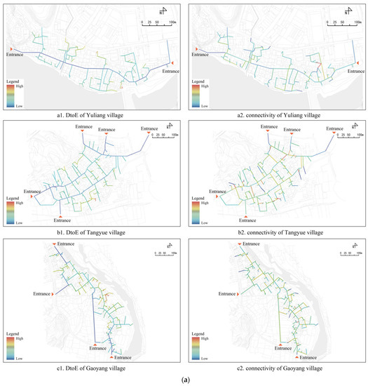 - Depth represents the topological distance between a starting node and the terminal node in a system, and it is a basic measure of space syntax [44]. In addition, after the connection angle between nodes in a spatial network is considered, angular depth is used to determine the shortest distance between them [45]. In this study, the metric step depth (MSD) calculated by following the shortest angular path between nodes is used to evaluate the shortest distance from a starting node to the village entrance (DtoE).