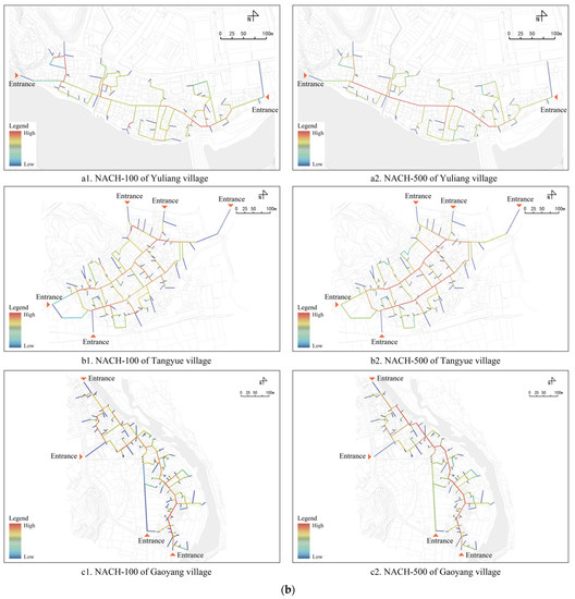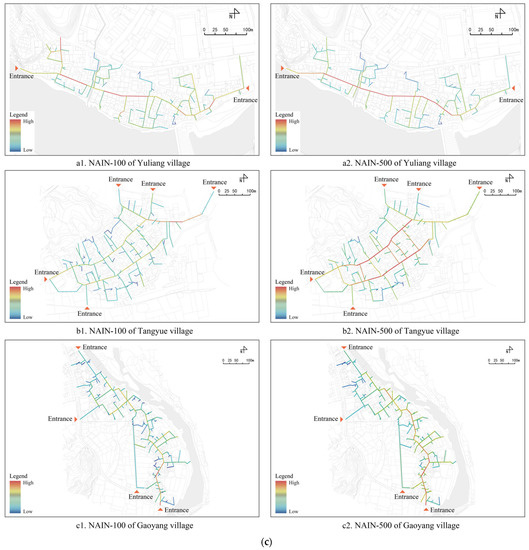 - Integration represents the accessibility of a spatial node [46]. A higher integration value indicates that the corresponding spatial node is more accessible in the system. Normalized angle integration (NAIN) can be used to compare the accessibility of spatial systems at different scales [47] and analyze the local integration of a system through different calculating radii to reveal the association between people’s activity and spatial systems [48,49]. According to the range of studied village scales, two radii of 100 and 500 m were used in this study to indicate walking accessibility. The calculation of NAIN is demonstrated in Formula (3)where NC is the total number of nodes, and TD is the total angular depth of a node in a system.