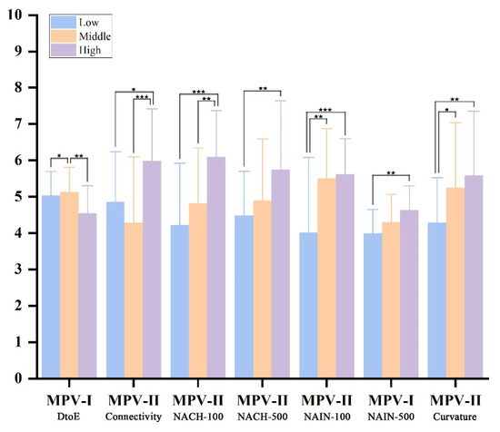 A multivariate analysis of variance (MANOVA) was applied to detect the associations between the pedestrian volume (MPV-I or MPV-II) and spatial configuration attributes (DtoE, connectivity, curvature, NACH and NAIN with two radii) of the street network. The results (Table 4) showed that all seven spatial attributes had significant influences on the pedestrian volume of the street network (p < 0.05). The partial eta square () indicates the effect size of each factor. As shown in Table 4 and Figure 7, the effects of DtoE (0.118) and NAIN-500 (0.123) on MPV-I were found to be much more significant than those of DtoE (0.047) and NAIN-500 (0.05) on MPV-II. Moreover, the effects of connectivity (0.006), NACH-100 (0.032), NAIN-100 (0.08) and curvature (0.02) on MPV-I were much less significant than those of connectivity (0.176), NACH-100 (0.214), NAIN-100 (0.186) and curvature (0.105) on MPV-II. In contrast to the pedestrian activity on the main road, which is intended for traffic, most social interaction activities were found to take place in the denser and more complex pathways of branch streets; thus, the impacts of NACH and NAIN with a larger street radius on MPV-II were weaker, while the impacts of connectivity, curvature, NACH and NAIN with a smaller radius were more significant.