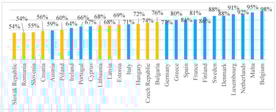 “It is an established fact that urbanization in developed countries is accompanied by economic growth and industrialization which mutually self-reinforce one another” []. Particular economic structures (employment, value addition and output per sector) are closely associated with the urban–rural dichotomy/divergence. For example, primary economic branches (e.g., agriculture) and some secondary ones (e.g., textile, smelting) usually reside in rural areas, not in metropolitan centers. The majority of the CEE population is urban-dwelling, but its share is far below the EU’s average (75% in 2020 []). Conclusively, the dispersion of the population also denies the completion of convergence between the old and new EU states. In agreement with past researchers [,,], we acknowledge that the gaps within the individual CEE countries are also significant, but investigating these was beyond the scope of the present study.