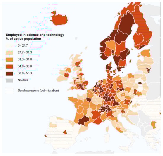 From Figure 3 (Source: ESPON Policy Brief, p. 11. []), it can be observed that net emigration characterizes the relatively underdeveloped regions, while immigration and high employment rates in the knowledge economy are observable in Scandinavia, Western Europe, Northern Italy and Southern England, and most importantly, all capital cities function as domestic hubs. The last point can be foremost exemplified by Romania, Hungary, North-Western France, Lithuania and Bulgaria.