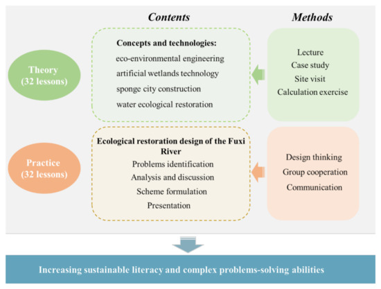 - Case study: A well-established method to help students improve their problem-solving and critical-thinking skills is used by exposing them to several real scenarios [23,24]. Students have group discussions and utilize previous knowledge to answer questions asked by the teacher. For example, in the Tongxin River restoration case, students are asked to discuss the relationship between water quality and ecosystems, water problems and their causes, and the corresponding treatment measures. In another case involving the Portland Rain Garden, students are asked to identify landscape elements and their role in rainwater management.