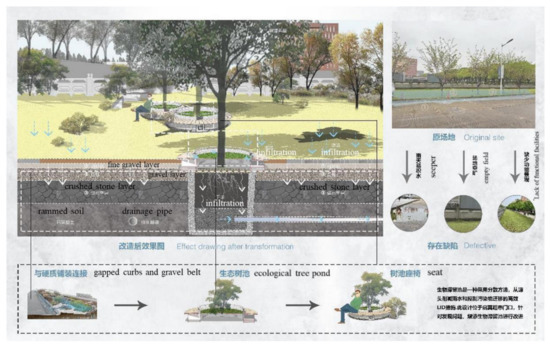 After the scheme was formed, due to limited time, the students only carried out the detailed design of one or two nodes. In response to the problem of water accumulation on the riverside road, another group chose to renovate the original green belt along the river and introduced the accumulated water into the green space below the road through the gapped curbs and gravel belt (Figure 4). Rainwater would be stored and purified by the filtration of plants, soil, and microorganisms collected through drains, and then be discharged into the river. At the same time, a seat around the tree pool was designed to increase rest functions and the richness of the vertical space.