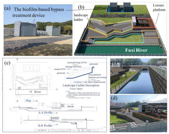 Some groups paid more attention to the improvement of the river landscape. For example, at the site of the original bypass treatment facility (Figure 5a), the students attempted to intervene in the “soft” and vital landscape to resolve the “contradictions” between the “hard” facility and nature. Figure 5b–e display a transformation of this open space into a sunken square to form a stepped, theater-like space for rest and activities. The use of lights and free curve polylines improved this space and its interest. Gravel pavement and permeable pavement were also used in this project to increase aesthetics and water permeability.