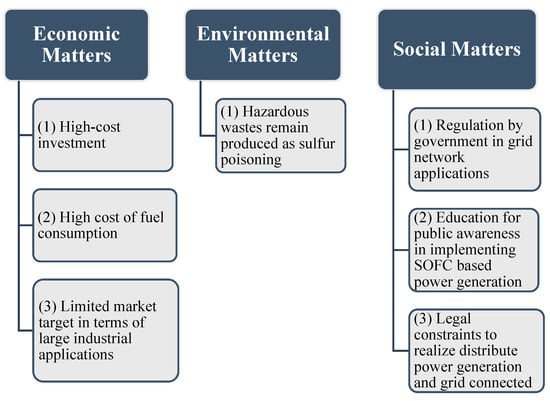 Despite the numerous benefits of the SOFC as a sustainable technology, it is mainly used in developed countries, especially European ones. The application of SOFCs across developing countries is scarce [9] due to the common thought about the high investment cost of new sustainable technology. In addition, transferring SOFC technology from laboratory scale to public scale can cause numerous issues (i.e., economic, environmental, and social opinions) [5] without any tangible benefits except being environmentally and socially compatible. Figure 1 shows the economic, environmental, and social issues in applying SOFCs.
