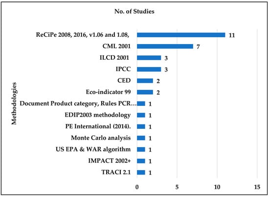 In terms of the methodologies for the environmental impact, 13 different methods and approaches were used in the prior studies, as shown in Figure 2. Eleven articles used ReCiPe approaches, seven used CML methods, three used both IPCC factors and ILCD methods, and two used Eco-indicator 99 and CED methods. Only one article used the CED, TRACI, Impact 2002+ US EPA & WAR algorithm, Monte Carlo analysis, PE International (2014), EPID2003 and document product category, Rules PCR 2007:08 method [6,7,8,39,40]. Detailed information about these methodologies is discussed in the following subsection.