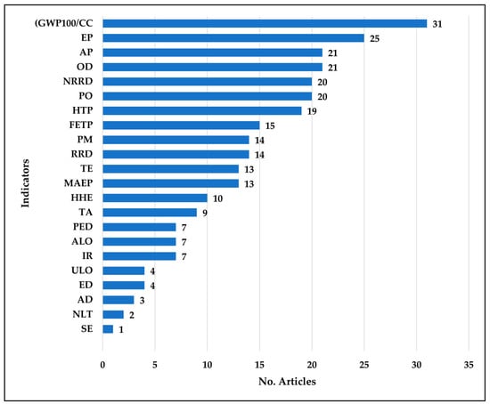 ReCiPe was initially introduced in 2008 in prior work [62]. It consists of 18 midpoint indicators and 3 endpoint indicators. The method was modified to ReCiPe 2016 to provide characterization factors that represent the global scale instead of the European scale [62]. Eleven studies [6,8,10,17,37,41,53,54,55,61,64] used the ReCiPe 2008 or 2016 or v1.06 or 1.08, particularly using a hierarchic perspective to classify indicator categories at midpoint and endpoint levels [9]. As shown in Table 3, Ref. [8,10] reflect the highest number of impact categories, including 17 midpoint indicators.
