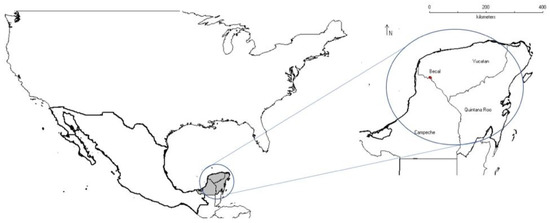 In this study, a hybrid maize Pioneer4082w obtained from a local seed supplier was used. This hybrid maize is commonly used by farmers of the region. Crops grown in the region’s intercropping systems are utilized primarily for human consumption and, secondarily, as green manure. The experiment was conducted from July 2021 to December 2021 as an on-farm trial on the land of a small-scale maize farm within a small area in Becal, Campeche, Mexico (20°26′55″ N, 90°2′6″ W) (Figure 1). The weather conditions during the growth stage of the intercrops in 2021 was as followed: the maximum, minimum, and mean temperature were 34.5, 18.8, and 26.6 °C, respectively; the precipitation was 516.02 mm. Soil samples were taken to a depth of 0 to 30 cm one week prior to the experimental establishment. The available N was measured using the alkaline permanganate method [33], the available P was measured using the Olsen method [34], and the available K was measured using a flame photometer [34]. The soil texture was clay. The soil bulk density of the plough layer (0–30 cm) was 1.25 g/cm3, the total nitrogen was 2500 ppm, the available phosphorus was 14.40 ppm, and the available potassium was 720 ppm. The soil’s high K content is very common in Mexico, where most soils (77%) exceed 200 ppm of potassium, so adding K is not recommended [35]. The organic matter was 3.89%, and the pH was 7.84.