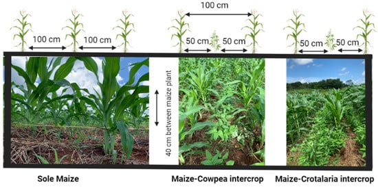 Schematic diagram indicating the different planting patterns. In the intercropping systems, 15 days following the maize planting dates, a legume was planted at 50 cm between the 100 cm interrow maize spacing. Created in BioRender.com, [38].