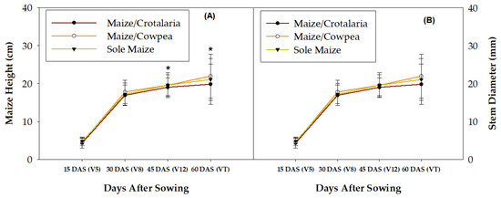 Maize height (A) and stem diameter (B) of maize in maize–legume intercropping, and sole maize systems grown under rainfed conditions of Becal, Campeche, 2021. * indicates treatments are significantly different from each other at p < 0.05.