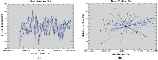 - Connection diagram and connection pair image generation: the super master image was the image dated 5 November 2018. The max normal baseline was set to 2%, and the max temporal baseline threshold was set to 60 days. Lastly, 316 image pairs were generated, as depicted in Figure 2a.