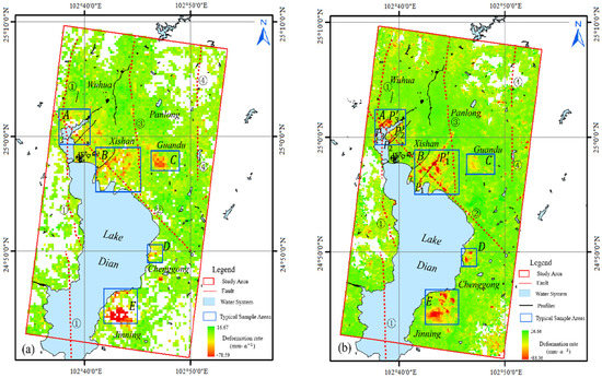 Deformation rate of the study area. (a,b) are results of PS-InSAR and SBAS-InSA processing respectively. ①~④ are Puduhe fault, Chenggong-Fumin fault, Heilongtan-Guandu, Baiyi-Hechong fault, respectively.
