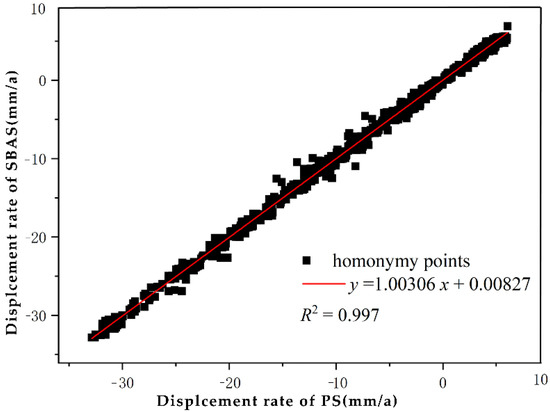 In Figure 3, the maximal annual subsidence rate maps obtained by PS and SBAS were, respectively, −78 mm/a and −88 mm/a, with a difference of 10 mm/a, thereby demonstrating that serious surface subsidence exists in the study area. The location and range of the subsidence area identified by the two methods are consistent. To further verify the reliability of the two methods based on the experimentally achieved results, the cross-comparison method was adopted to verify the results. In that process, 532 identical points were randomly extracted from the subsidence rate maps generated by employing the PS-InSAR and the SBAS-InSAR respectively. The correlation coefficient diagram was drawn by applying the average annual subsidence rate of PS as the horizontal axis and with the average annual subsidence rate of SBAS as the vertical axis (Figure 4). The correlation coefficient R was 0.998, R2 was 0.997, thereby demonstrating that the experimentally achieved results in this study have high correlation and consistency.