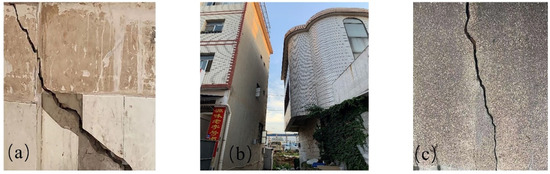 Field photos. (a–c) A house wall crack, house tilt and road foundation deformation cracking caused by the subsidence, respectively.