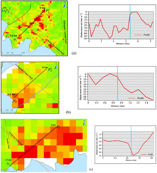 Velocity and cross-section diagram of fault in the study area. (a–c) are plots of displacements along profiles , and , respectively.