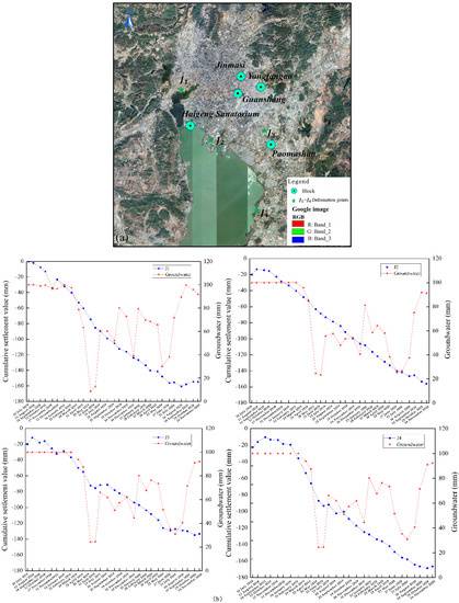 Given the survey, the groundwater extracted in the area mainly contained pore water, karst water and fissure water. It was primarily employed for industrial, construction, domestic, etc. As April 2021, Kunming has been using overall 1711 underground wells (i.e., 1498 cold water wells and 213 hot water wells). Cold water wells were largely distributed in five districts (i.e., Chenggong, Guandu, Xishan, Panlong and Wuhua districts), and hot water wells had the major distributions in Guandu District and Xishan District. Since 2008, Kunming city has issued a series of regulations and documents to strengthen the protection, utilization and management of groundwater. On the whole, 441 cold water wells have been closed (e.g., 369 in the main urban area of Dianchi Basin). Although the groundwater utilization has slowed down to a certain extent, groundwater is still over-utilized. The statistical table of groundwater level changes in the study area (Table 4) was obtained the collation of historical information from the environmental monitoring stations in Yunnan Province, and the corresponding groundwater exploitation sites in the blocks are shown in Figure 8a. In the early 1980s, the burial depth of the hot water level was 4~6 m, and the single well gushing water volume was 1000~1700 m3/d. However, the current water level is generally lower than the water level when the well was completed, and the average burial depth of the water level has increased to 11~25 m; the maximum decline value is more than 35 m, the average decline rate is 1.80 m/a, and the maximum is 4.59 m/a [46]. The groundwater exploitation and water level landing funnels in Kunming over the years confirmed that there was a clear correlation between ground subsidence and the continuous decline of groundwater levels [37]. Since the groundwater exploitation data could not be obtained, we used the groundwater data released by NASA to obtain groundwater data for the same period, and analyzed four regional subsidence feature points. The point distribution of the four feature points () is illustrated in Figure 8a. The results of the analysis are shown in Figure 8b, and the cumulative subsidence values of the four points have obvious correlation with the seasonal changes of groundwater level. In addition, Kunming was located in the crustal active zone, covering the intermountain basin, valley basin pores, fractures, karst water area with a wide range of carbonate rock and karst caves distributed and with funnels scattered all over the city. The underground confined water in the bedrock exhibits a certain supporting function. Under the excessive exploitation of groundwater and the soil weight pressure, the bedrock is easy to lose its support, thereby causing several geological disasters (e.g., ground collapse, foundation subsidence and earthquake).